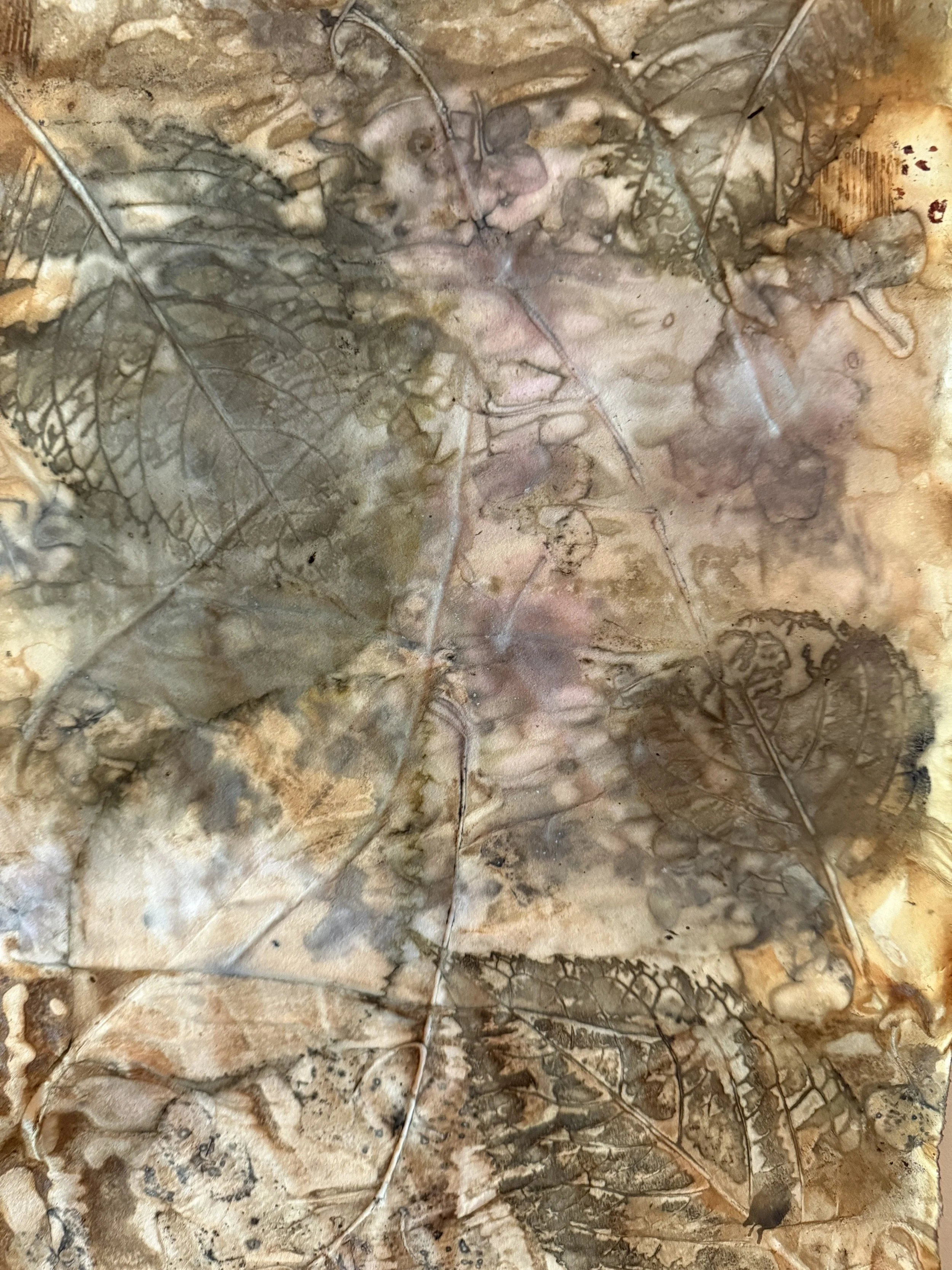 Eco Printing, the general name for this contact process, uses the natural pigments of plant material to transfer imagery using heat to a substrate, often paper or fabric.