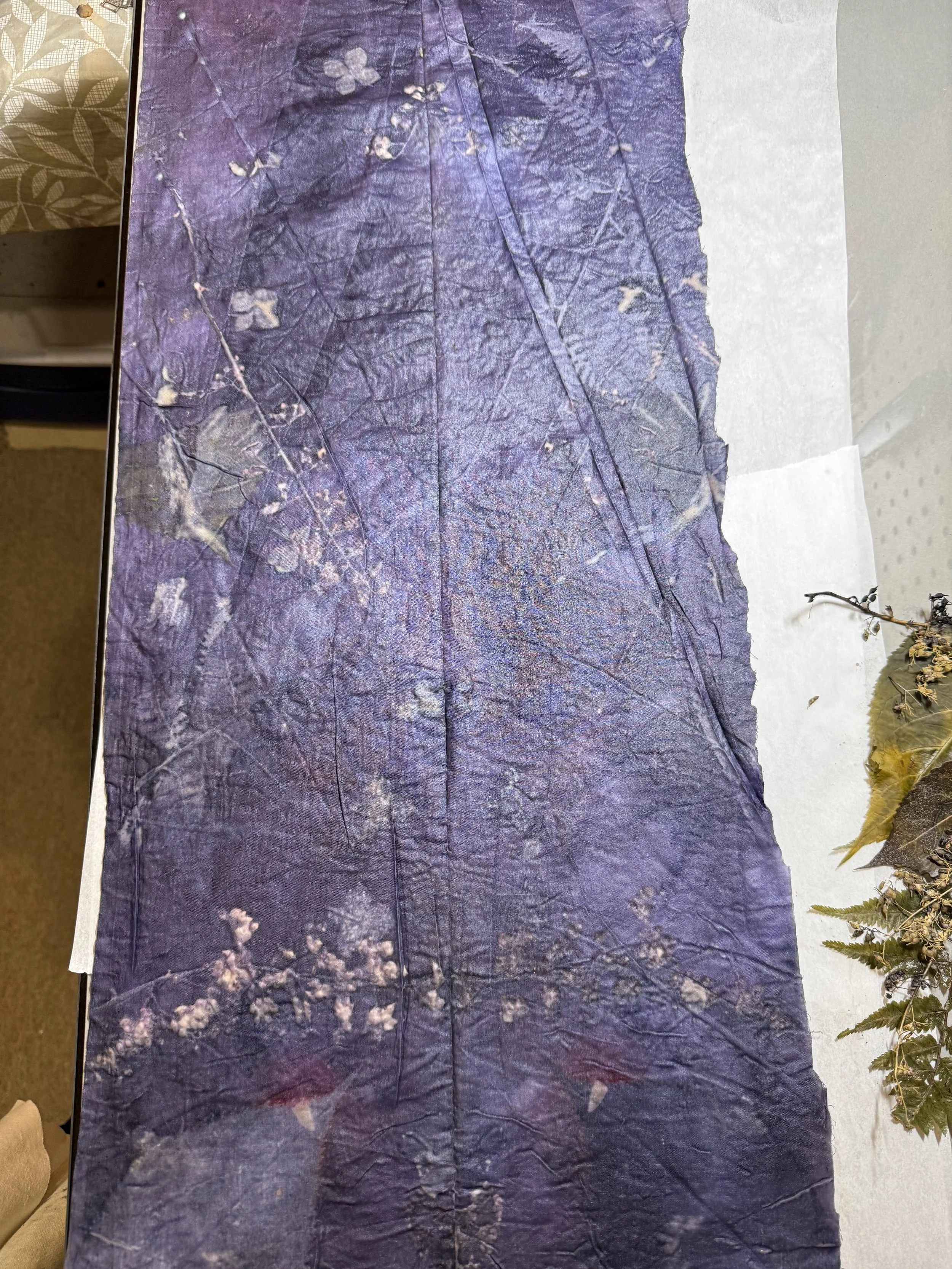 The Eco Printing process involves a number of steps - preparing the substrate, in this case fabric, to accept the dye transfer; composing the plant material for a pleasing composition; covering with a dye blanket, bundling tightly to maintain contact; immersion in the prepared “hot pot” for 90 minutes or more; then unrolling to reveal the transfer.